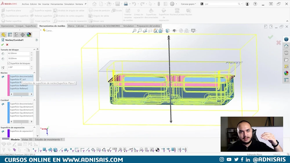 Para poder usar las herramientas de diseño de moldes tienes que tener haber llevado previamente los cursos: básico, avanzado de partes, de ensambles y de superficies. Aquí veremos como reparar geometría importada, cómo extraer la pieza principal del bloque para tener el corazón y la cavidad, cómo crear los insertos, carros deslizantes, verificar ángulos de salida y otras herramientas adicionales. Quisiera ser claro que aquí NO voy a profundizar sobre el proceso de inyección de plástico, inyección de aluminio, forjado, fundición, troquelado y otros procesos que dependen de moldes, los menciono pero sería poco practico hablar por ejemplo de cómo calcular los canales de enfriamiento si al final tu vas a realizar moldes para troqueles, o hablar sobre la deformación de la lamina al troquelar si tu vas a irte por la parte de inyección de plástico. Detalles del curso: 6:09 horas de video Temario: - Introducción a las herramientas de diseño de moldes - Analisis de ángulo de salida y superficies desconectadas - Operación de corazón y cavidad - Carros laterales y lifters - Lineas de partición - Superficies desconectadas - Métodos alternativos de diseño de moldes - Manipulación de superficies para moldes - Creación de operaciones de biblioteca - Integración de la cavidad con el molde